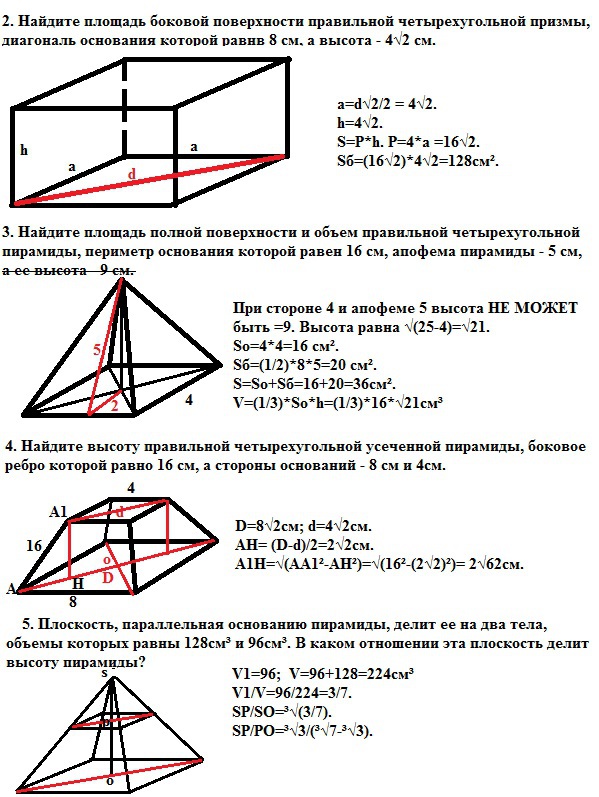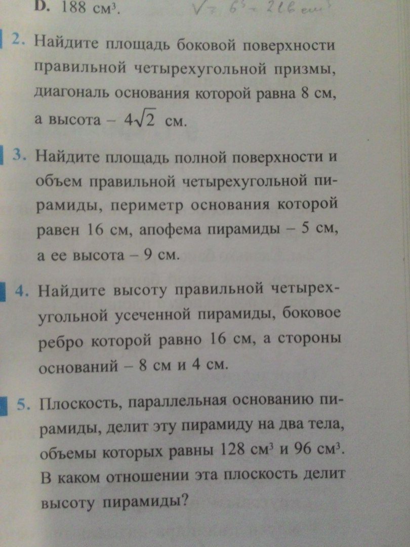 3. Найдите площадь полной поверхности и объем правильной четырехугольной пирамиды, периметр основания которой равен 16 см, апофема пирамиды - 5 см, а ее высота - 9 см. Тут явная ошибка в данных. Если сторона основания равна 16/4=4, апофема = 5, то высота по Пифагору должна быть =√21. (√(25-(4/2)²). Решаем для этих данных: