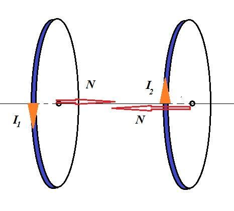 Как взаимодействуют 2 кольцевых проводника,если их плоскости расположены параллельно друг другу,а токи протекают в противоположных направлениях?