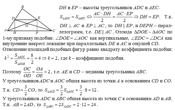 DEPH - прямоугольник. Заметили , что AE и DC медианы для треугольника ABC. КРАСИВО ! ⇒ S(ABC) =3S(AOC) =3*8 =24.