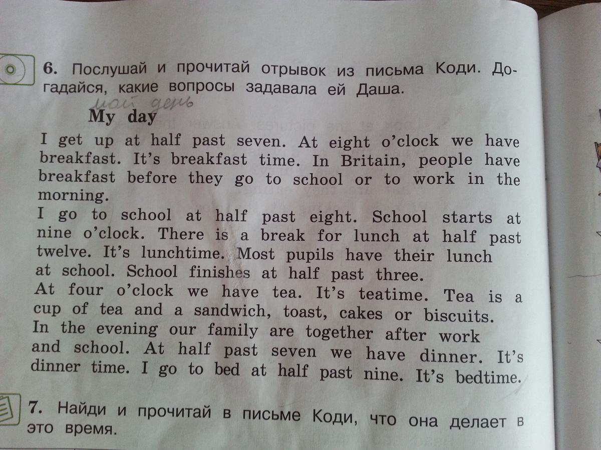 Мой день я встаю в половине восьмого. В восемь o'clnek мы имеем завтрак. Пришло время для завтрака. В Великобритании люди имеют завтрак перед тем как идти в школу или на работу утром. Я хожу в школу в половине девятого. Школа начинается в девять часов. Существует перерыв на обед в половине первого. Время обеда. Большинство учеников имеют свой обед в школе. Школа заканчивается в половине четвертого. В четыре часа мы имеем чай. Это чаепитие. Чай является чашка чая и бутерброд, тосты, пироги и печенье. Вечером наша семья вместе после работы и учебы. В половине восьмого мы имеем обед. Пришло время обеда. Я ложусь спать в половине десятого. Это перед сном.