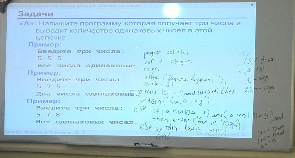 if (a=b) and (b=c) then writeln('Все 3 числа одинаковые')