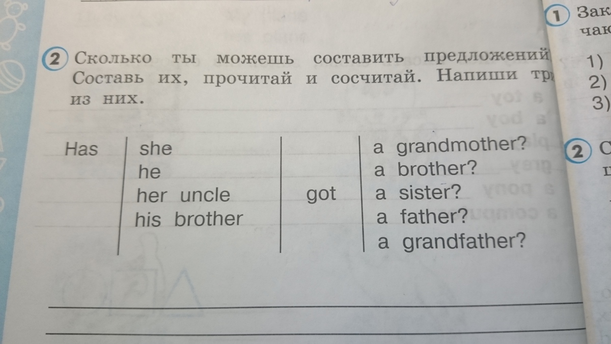 Has she got a sister.Has her uncle got a father.Has he got a grandmother.Has his brother got a grendfather.