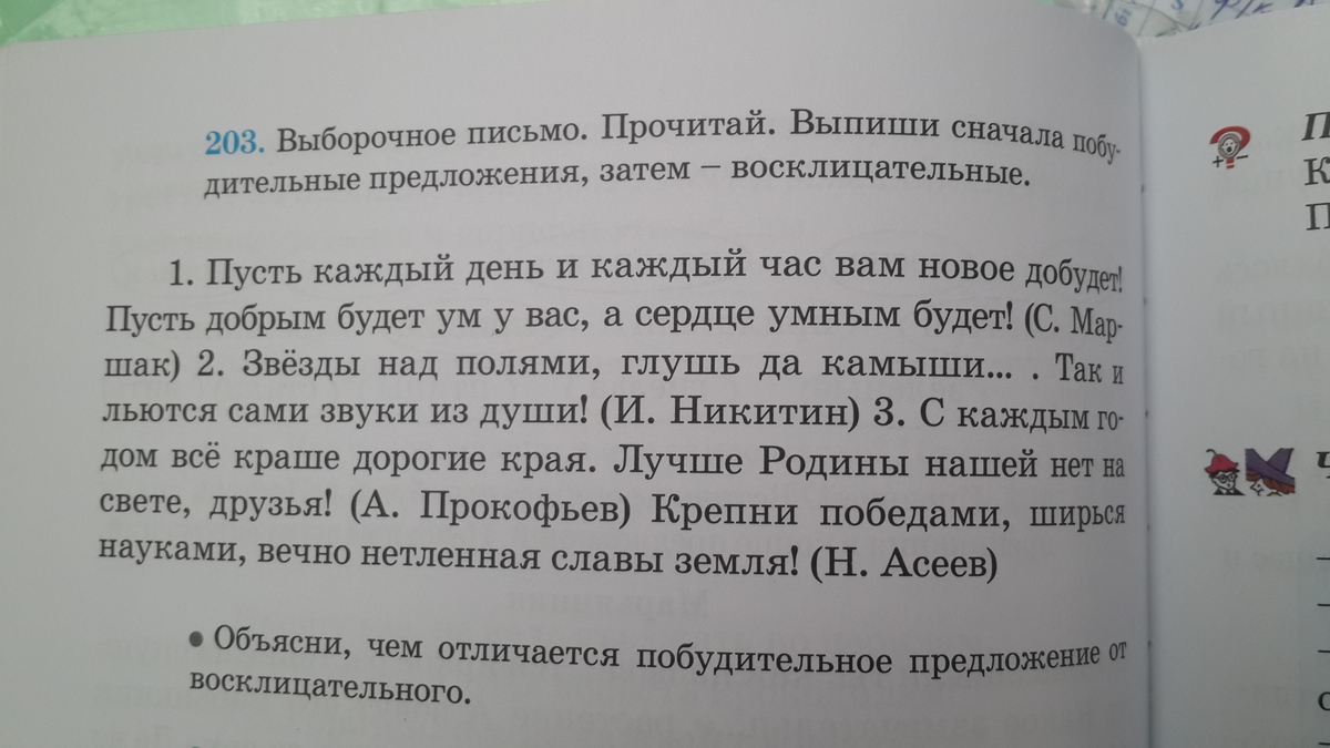 упражнение 203)))))))выпишите сначалв побудительные предложения а затем восклицательные