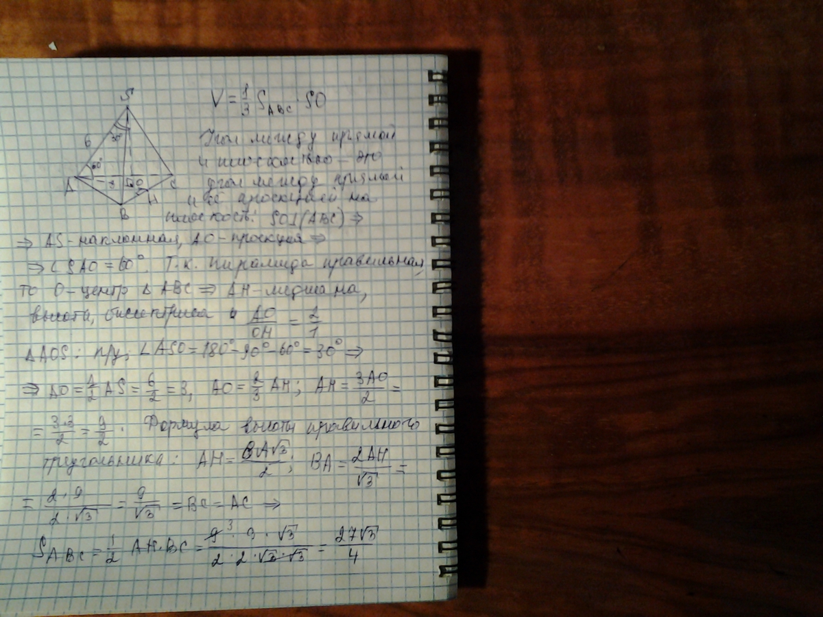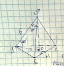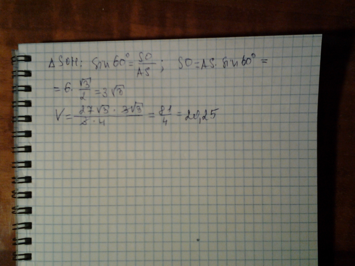 Из треугольника ASO SO = AS*sin A = 6√3/2 = 3√3. Это высота.