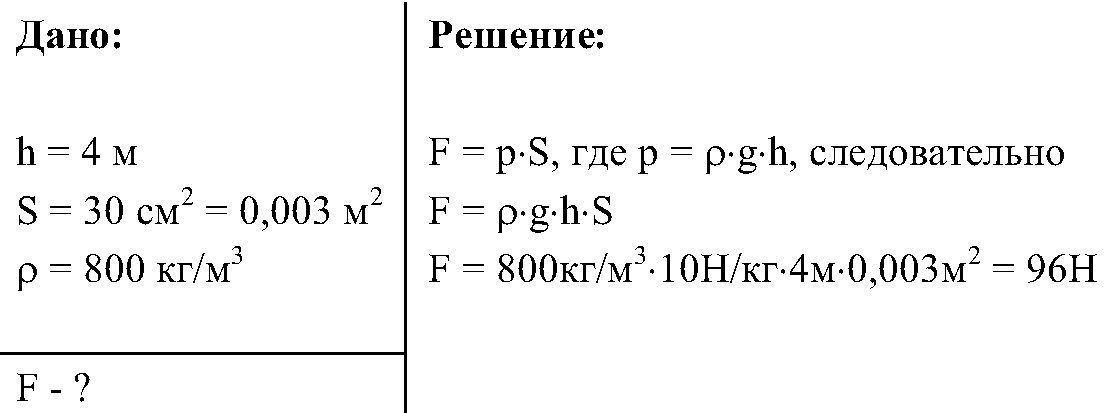 В цистерне,заполненой нефтью,на глубине 4m поставлен кран,площадь которого равна 30см2.С какой силой давит нефть на кран?