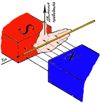 Правило левой руки - определяет направление силы которая действует на проводник с током находящийся в магнитном поле. Если ладонь левой руки расположить так, чтобы вытянутые пальцы были направлены по току, а силовые линии магнитного поля входили в ладонь (перпендикулярно), то отставленный в сторону большой палец укажет направление силы, действующей на проводник.