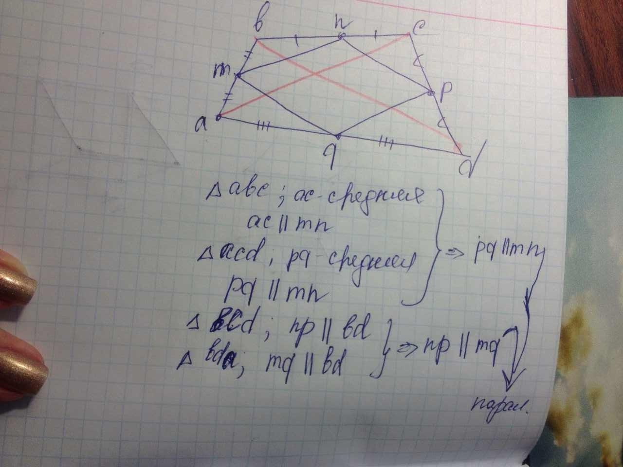 в выпуклом четырехугольники abcd точки m, n,p,q- середины отрезков ab bc cd ad соответственно. докажите что mnpq параллелограмм