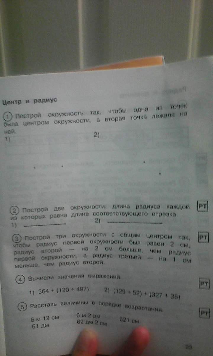 расстояние между этими двумя точками, по сути, это радиус окружности. ставь ножку циркуля в одну из точек и на вторую точку. кароч, фото уже прислать не могу(