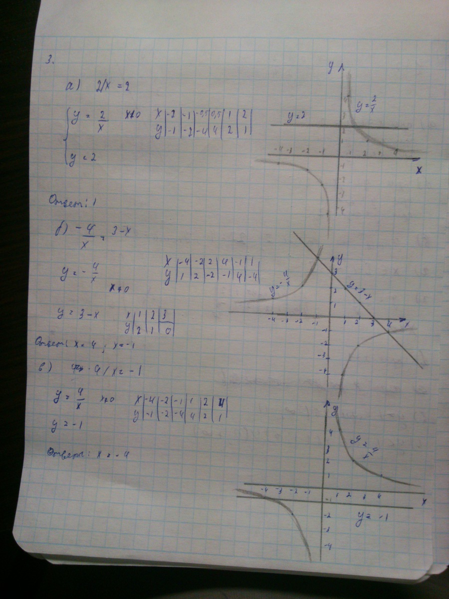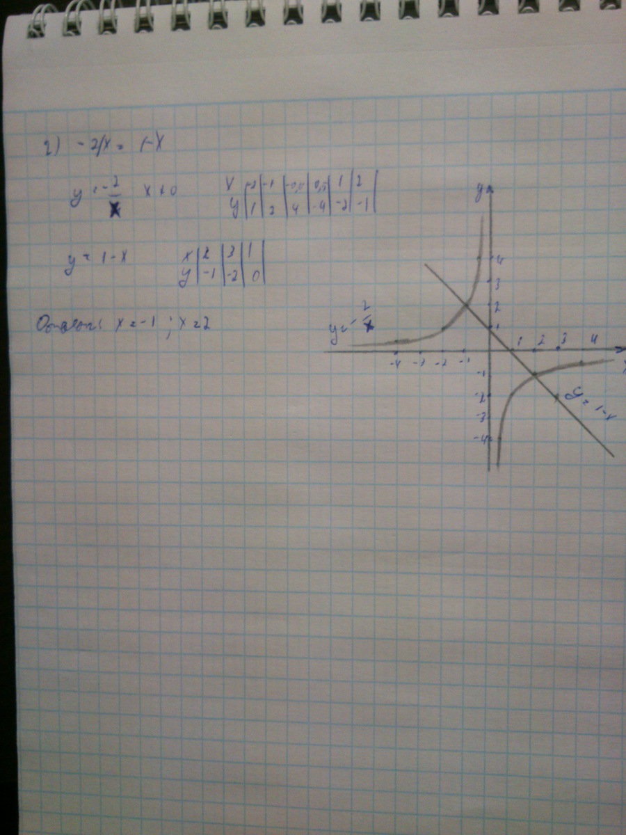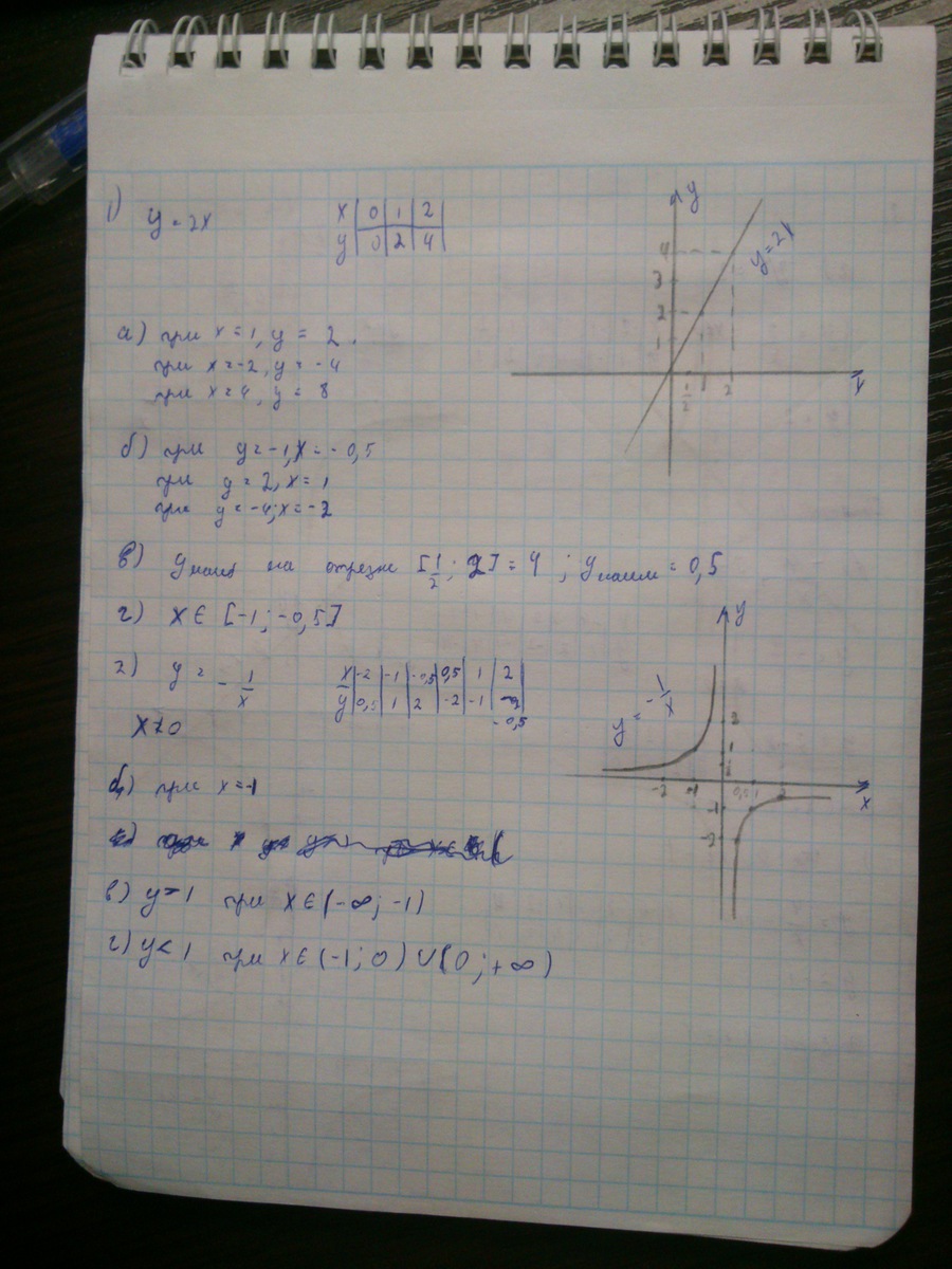 Постройте график функции y=2x.с помощью графика найдите:а)значения y при x=1;-2;4;б)значения x,если y=-1;2;-4;в)наименьшее и наибольшее значения функции на отрезке [1/2;2]г)какому промежутку принадлежит переменная x,если y € [-2;-1].а)Постройте график функции y=-1/x.б)найдите,При каких значениях аргумента значение функции равно 1.в)При каких значениях x y>1?г)При каких значениях x y<1?Решите графически уравнение:а)2/x=2;б)-4/x=3-x;в)4/x=-1;г)-2/x=1-x. Описание графиков,таблица значений,сам график и решения.Пожалуйста кому не сложно,буду очень благодарна!