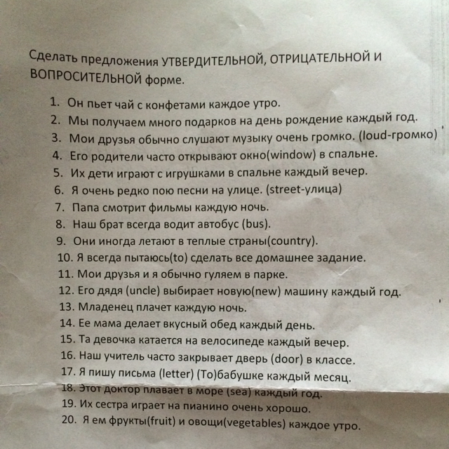 1. He drinks tea with chocolates every morning? 2. We get a lot of gifts for his birthday every year! 3. My friends usually listen to music very loudly. (Loud-rromko) 4. His parents often open a window (window) in the bedroom. 5. their children play with irrushkami in the bedroom every night. 6. I rarely sing songs on the street. (Street-street) 7. Dad watching movies every night. 8. Our brother always drives a bus (bus). 9. They sometimes fly to warmer climates country). 10. I always try to) do all your homework. 11. My friends and I used to walk in the park of 12. His uncle (uncle) selects a new new) car every year. 13. The baby was crying every night. 14. Her mom does a delicious lunch each day. 15. That girl rides a bike every evening. 16. Our teacher often closes the door (door) in the classroom. 17.ya write letters (letter) then) my grandmother every month. this doctor is floating sea (sea mamdm year 19 of their sister plays the piano very well 20? I eat fruit fruits) and vegetables (vegetables) every morning.