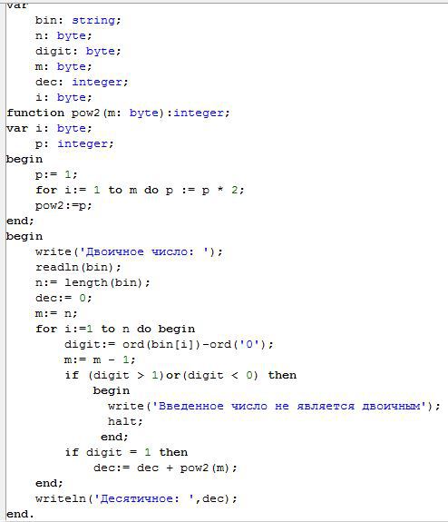 Нужно написать программу на Паскале для перевода натурального числа из двоичной системы в десятичную (в двоичном числе не более 10 цифр).