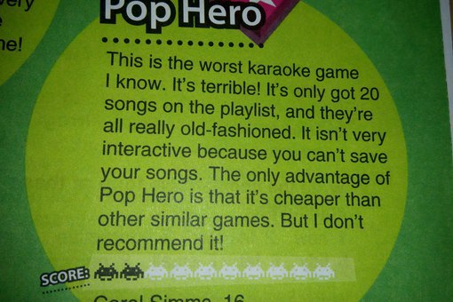 Это самая худшая караоке игра которую я знаю. Она ужасная! Она только имеет 20 песен на плейлисте,и при этом,они очень старомодные. Она не очень интерактивная потому-что ты не можешь сохранять свои песни. Единственный плюс в игре "Pop Hero" это то что он дешевле чем другие похожие на него игры. Но я не рекомендую ее!
