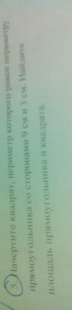 5.Начертите квадрат,периметр которого равен периметру прямоугольника со сторонами 9 см и 3 см.Найдите площадь прямоугольника и квадрата.