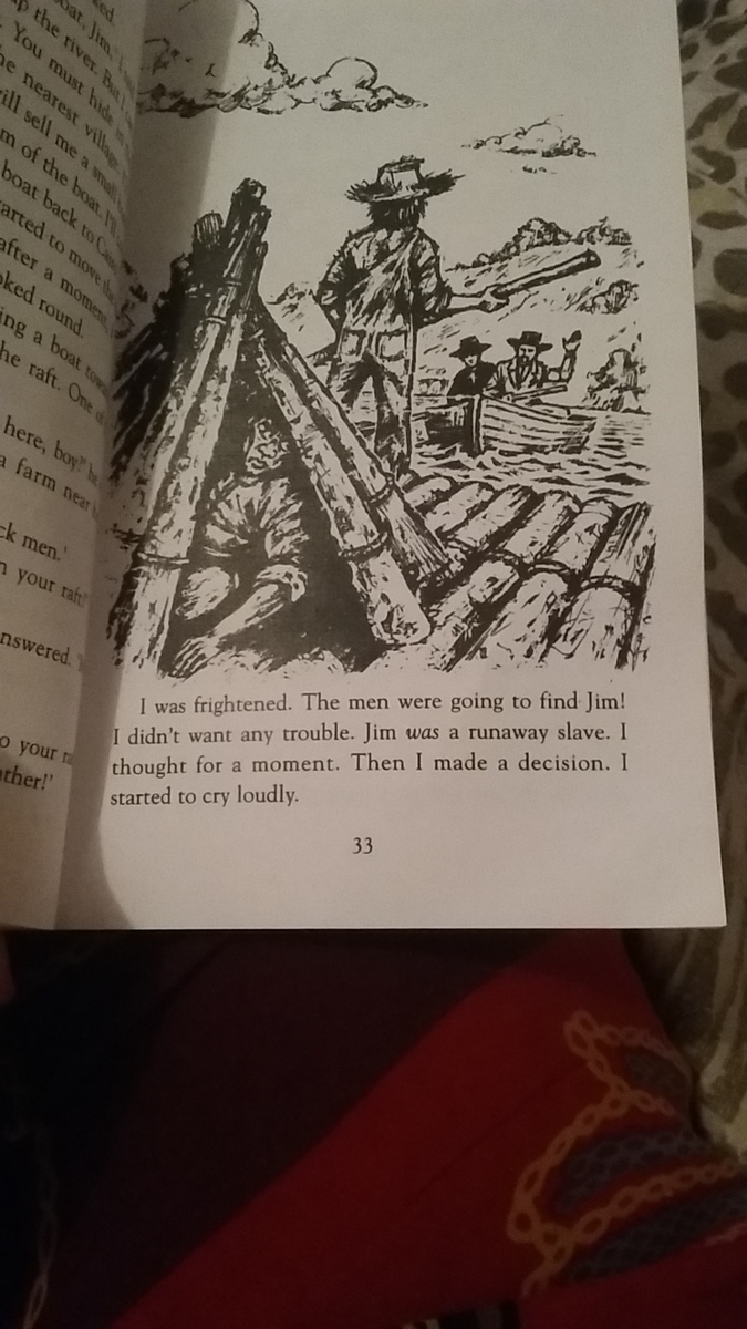 Я испугался. Люди хотели найти Джима! Я не хотел неприятности. Джим был сбежавшим рабом. Я думал несколько минут. Затем я принял решение. Я начал громко кричать.