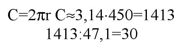 расстояние между серединами зубьев зубчатого колеса, измереного по дуге равно 47,1 мм . Диаметр колеса равен 450мм. Сколько зубьев имеет колесо?