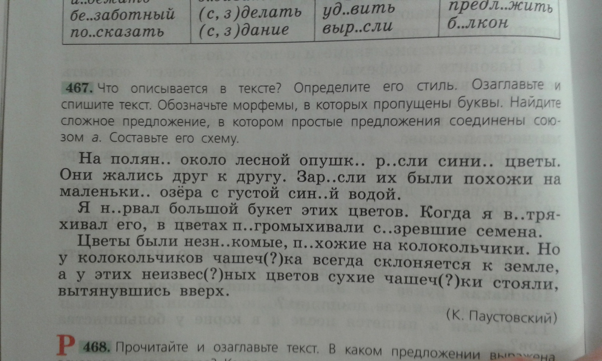 На поляне около лесной опушки я увидел синие цветы. Они жались друг к другу. Заросли их были похожи на маленькие озёра с густой синей водой. Я нарвал большой букет этих цветов. Когда я встряхивал его, в цветах погромыхивали созревшие семена. Цветы были незнакомые, похожие на колокольчики. Но у колокольчиков чашечка всегда склоняется к земле, а у этих неизвестных цветов сухие чашечки стояли, вытянувшись вверх.