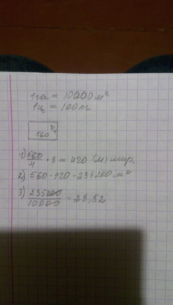 ) Участок прямоугольной формы длиной 560 м, а шириной 3/4 его длины, засеяли фасолью. Сколько семян потребуется для замеса участка если на 1 га высеяли 1 ц?