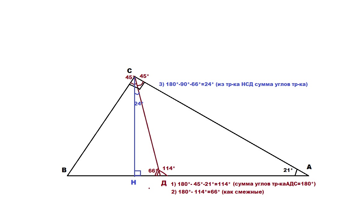 Один из острых углов прямоугольного треугольника равен 21 градус. Найти угол между биссектрисой и высотой, проведенной из вершины прямоугольного угла.