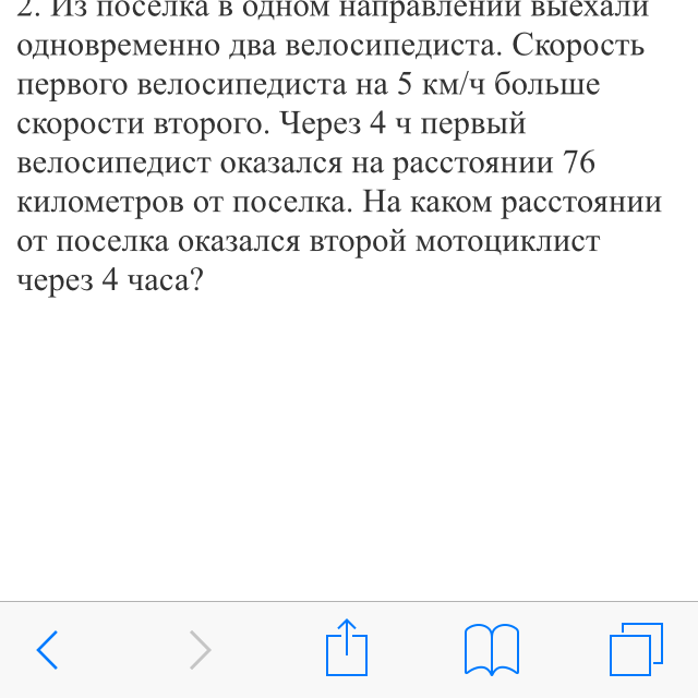 Из посёлка в одном направлении выехали одновременно два велосипилиста. Скорость первого на 5 км/ч больше скорости второго. Через 4ч первый оказался на расстоянии 76км от посёлка. На каком расстоянии будет второй велосепедист через 4ч от посёлка???