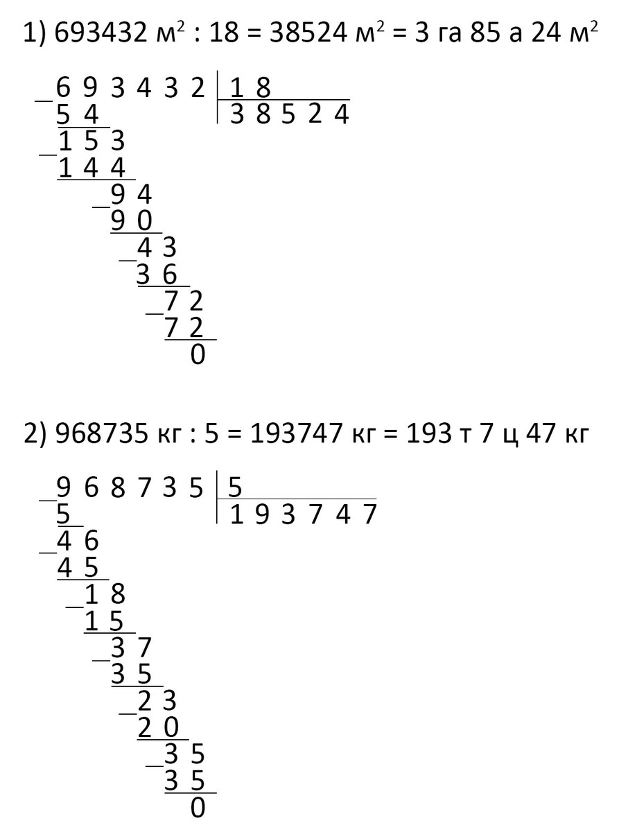 выполни деление велечины на число столбиком 693432кв.м:18 = , 968735кг :5= пожалуйста столбиком не в строчку!!!!
