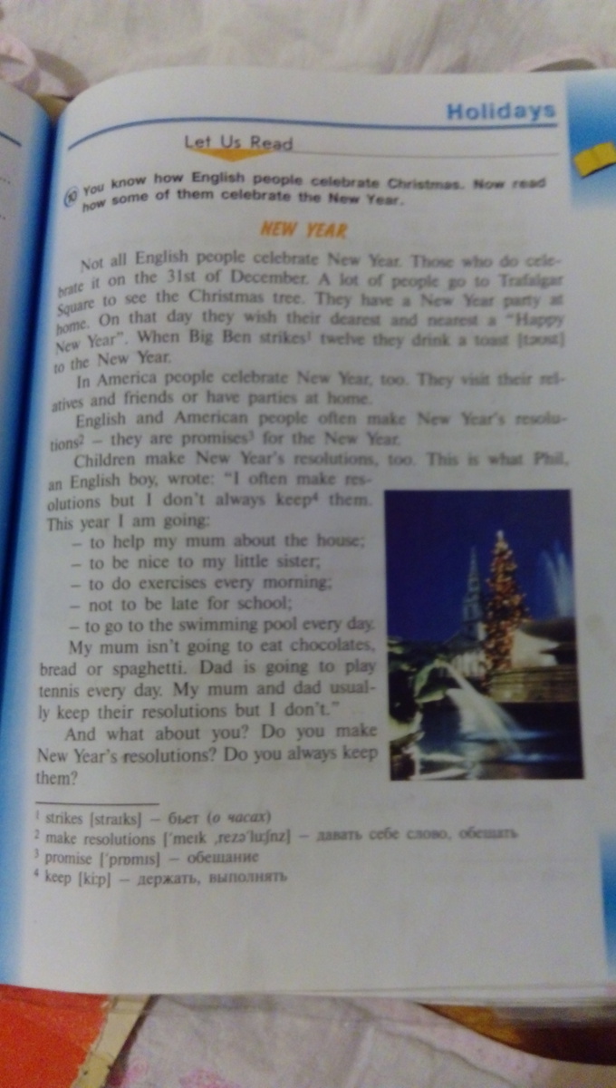 Все английские люди празднуют Новый год Те, кто делают отмеча Nate его на 31 декабря. Многие люди идут в Трафальгаре, чтобы увидеть елку. Они имеют новый год смешно SE в тот день, когда они хотят, чтобы их любимых и близких году, когда Биг-Бен пробьют двенадцать они пьют тост Ритуал Новый год В американских люди празднуют Новый год, также они посещают их mi- дает и друзей или устраивать вечеринки дома, английские и американские люди часто делают резолюции новогодние: они являются обещаниями для детей Новый год делают новогодние резолюции, тоже. Это то, что Фил. на английском мальчик, писал: "Я часто принимают решения, но я не всегда держать их в этом году я собираюсь помочь моей маме о доме, чтобы быть хорошим к моей маленькой сестре, чтобы делать упражнения каждое утро, чтобы не опоздать на. школа. ходить в бассейн каждый день моя мама не собирается съесть шоколад, хлеб или спагетти, папа собирается играть в теннис каждый день. Моя мама и папа usual- LY держать свои решения, но я этого не делают. " А что насчет тебя? Вы делаете резолюции Новый год? Всегда ли вы держите