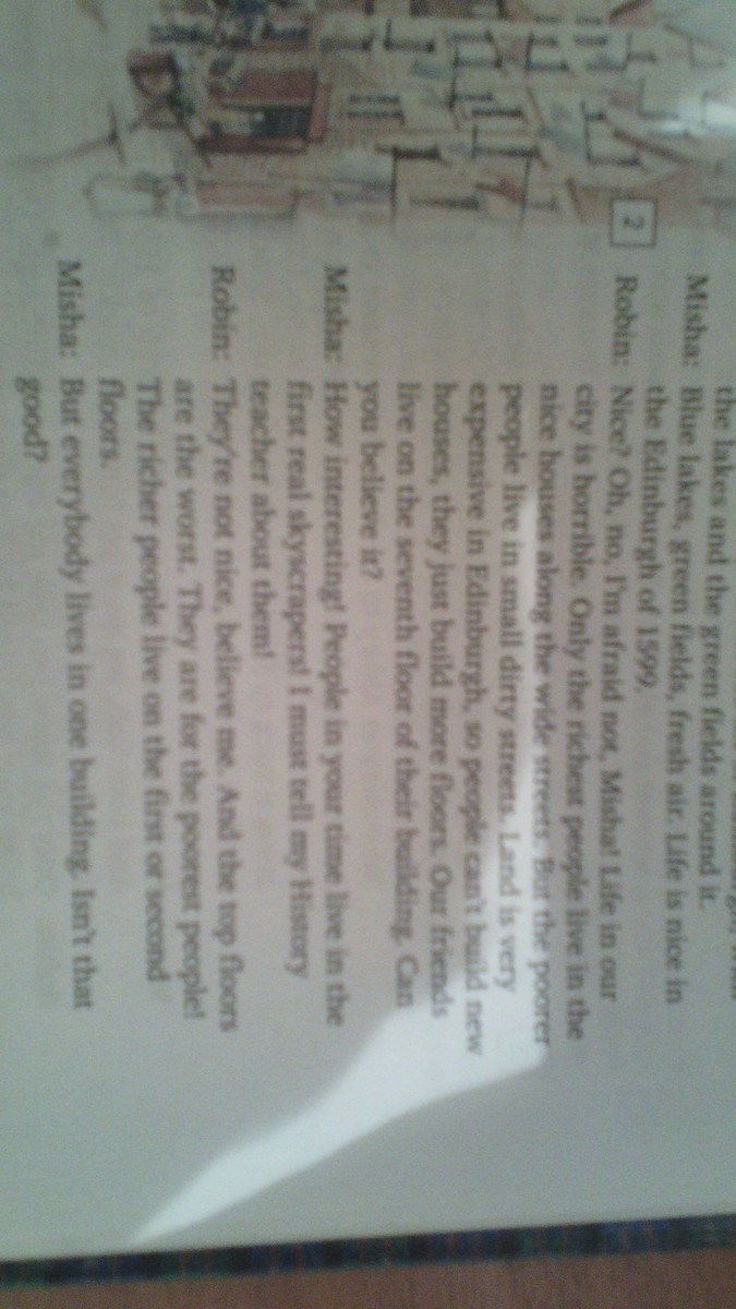 Робин: Прекрасна? О, нет, боюсь, что нет, Миша! Жизнь в нашем городе ужасна! Только самые богатые люди живут в хороших домах вдоль широких улиц. Но те кто победнее живут на маленьких грязных улицах. Земля в Эдинбурге очень дорога, поэтому люди не могут строить новые дома, они лишь строят больше этажей. Наши друзья живут на седьмом этаже здания. Ты можешь в это поверить?