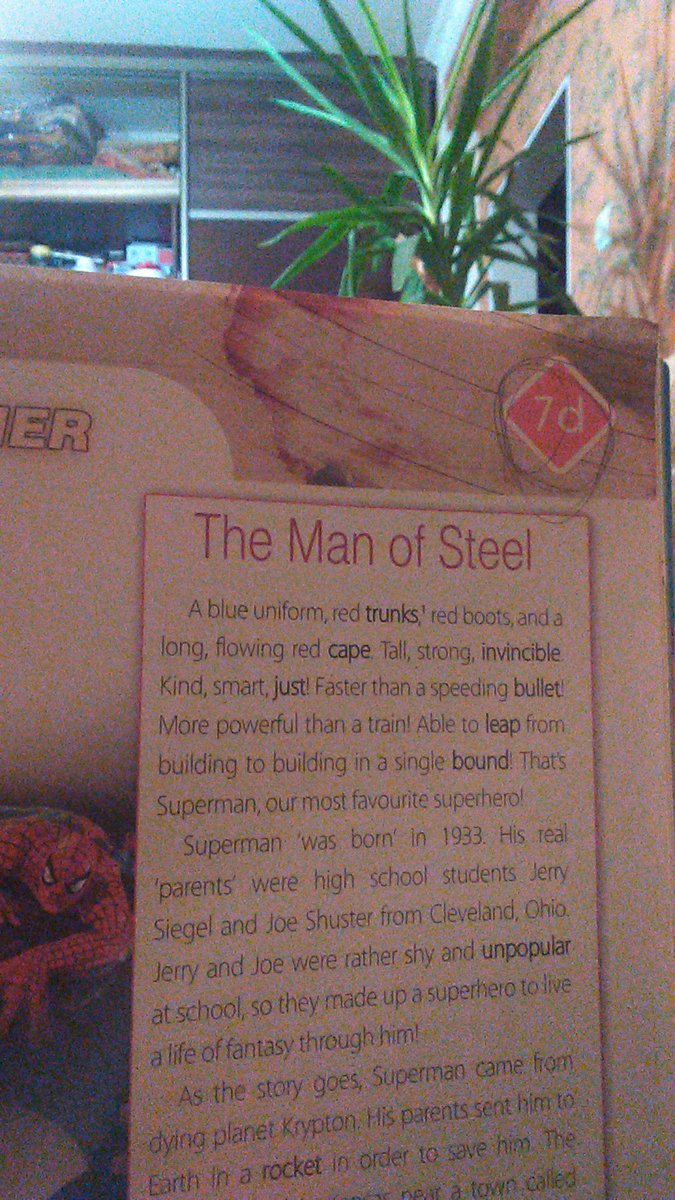 Синей форма, красные костюм, сапоги и длинная,развивающаяся накидка. Высокий, сильный, непобедимый. Добрый, умный! Быстрее скорости пули! Мощнее поезда! В состоянии прыгнуть от здания к зданию в один прыжок! Вот Супер, наш самый любимый супергерой!Супермен "родился" в 1933 году,его реальные"родители" были студенты средней Школы Джерри Сигел и Джо Шустер из Кливленда, штат Огайо. Джерри и Джо были довольно застенчивы и непопулярны в школе, так что они сделали до супергероя жить жизнью фантазии через него!Как гласит история, Супермен пришел от смерти планеты Криптон. Его родители отправили его на Землю в ракете, чтобы спасти его. Ракета упала в Канзасе вблизи города под названием Смолвиль. Пара фермеров нашели мальчика, усыновили его и назвали его Кларк. Как Кларк подрос, он получил силу от Солнца К тому времени он был взрослым и мог летать, обладал тепловым видением глаз и мог видеть сквозь стены. С этого момента он был Супермен - Супермен является символом американской мечты. Он является человеком, который усердно и успешно трудится . Он также является классическим героем, который борется с преступниками и спасает беспомощных. Он супергерой, которого мы все знаем и любим!