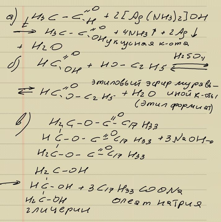 Составьте уравнения реакций, укажите условия их протекания, назовите органические продукты: а) Взаимодействие этаналя с аммиачным раствором оксида серебра б) Взаимодействие метановой кислоты с этанолом. в) Взаимодействие триолеин глицерида с раствором гидрооксид натрия.