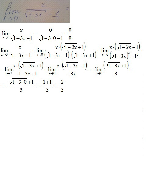 =lim([x*(√(1-3x)+1)]/[(√(1-3x))²-1²]=lim([x*(√(1-3x)+1)]/[1-3x-1])=