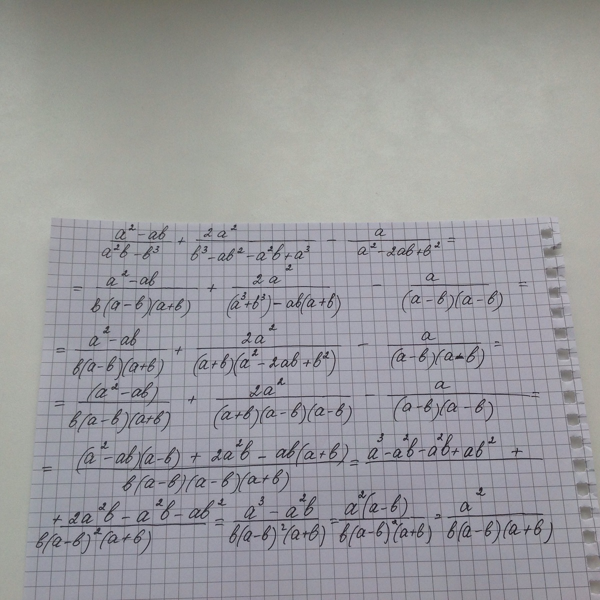 ((a^2-ab):(a^2b-b^3))+((2a^2):(b^3-ab^2-a^2b+a^3))-((a):(a^2-2ab+b^2))
