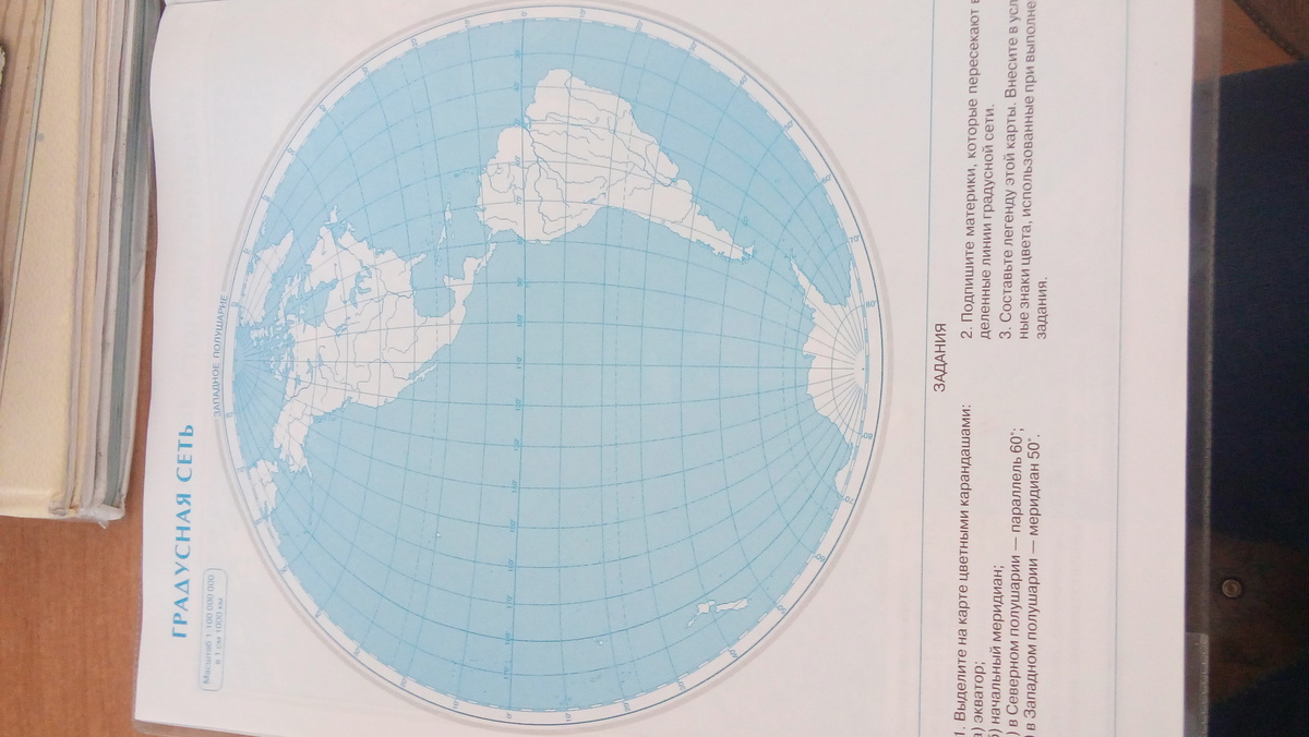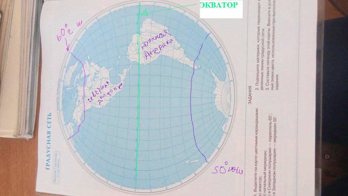 ВСЕ ОБОЗНАЧЕНО во вложенном файле. А начальный меридиан на карте западного полушария не виден, он проходит через Лондон- в восточном полушарии