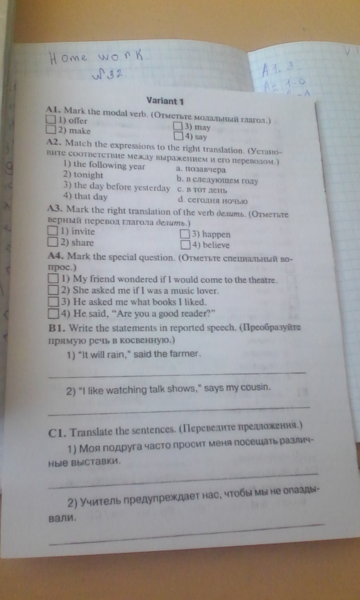 А1-3; А2-1b, 2-d, 3-a, 4c; А3-2; А4-4; В1- 1)The farmer said that it would rain, 2) My cousin said that he liked whatching talk shows; С1: 1)my friend often asks me to visit different exhibitions. 2) The teacher warns us not to be late