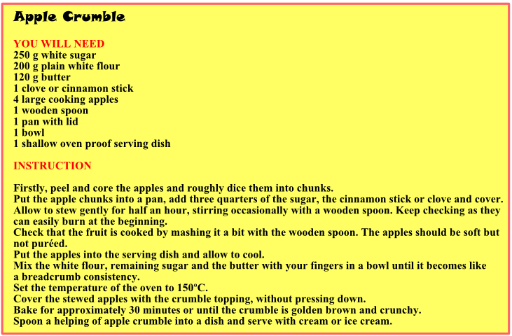 Приготовление или рецепт яблочного пирога или какого-нибудь торта на английском языке именно со словами для 6 класса