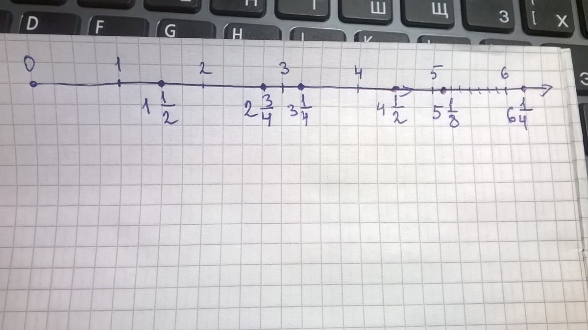 начертите координатную прямую ( возьмите единичный отрезок, равный 4 клеткам тетради). отметьте на ней числа 1 целая 1|2, 2 целых 3|4, 3 целых 1|4, 4 целых 1|2, 5 целых 1|8, 6 целых 1|4.