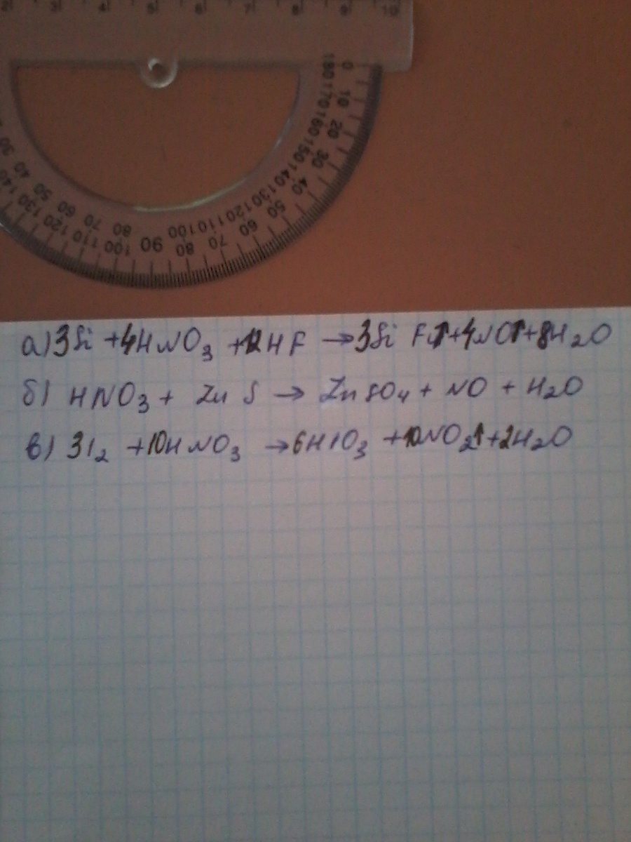 Расставьте коэффициенты в схемах реакций: а) Si+HNO3+HF(стрелка)SiF4+NO+H2O. б)HNO3+ZnS(стрелка)ZnSO4+NO+H2O. в)I2+HNO3(стрелка)HIO3+NO2+H2O.