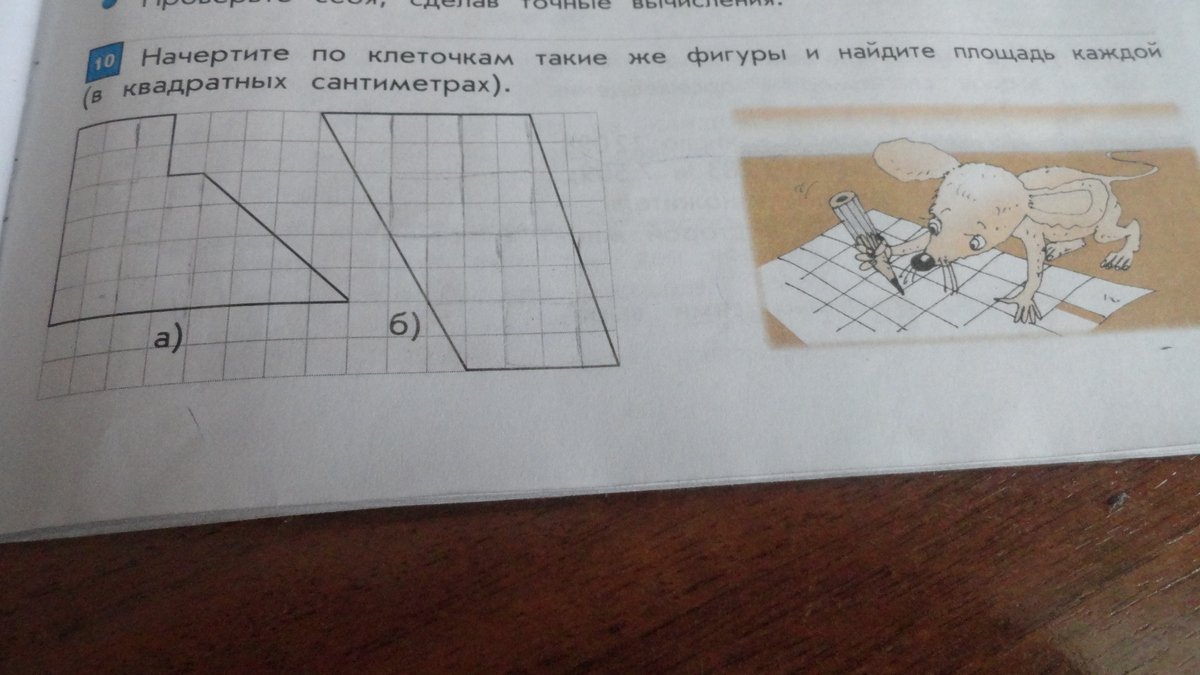 Начертите по клеточкам такие же фигуры и найдите площадь каждой в квадратный сантиметрахсантиметрах с решением