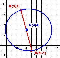 а, б диаметр окружности.Определите координаты центра и радиус окружности если А (3,7) и В (5,-1)
