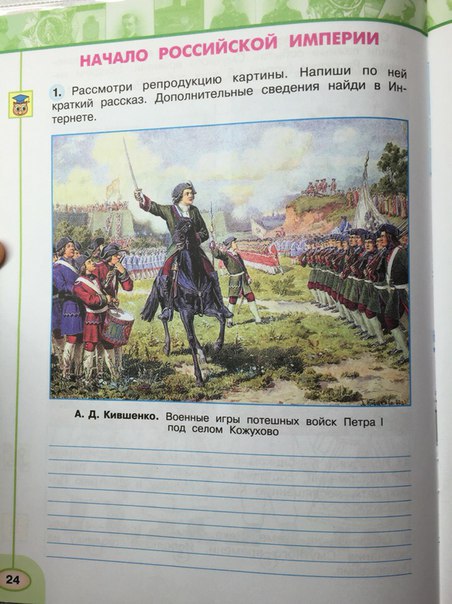 Ответ: Художник Кившенко изобразил на своей картине военные игры молодого Петра I. Юный Петр едет верхом на коне с саблей в руке, выступая в роли главнокомандующего. Рядом с государем - барабанщик, отбивающий ритм и трубач.