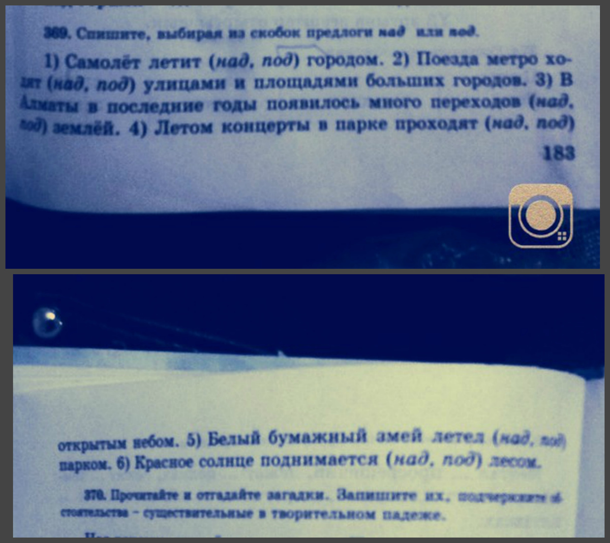 1. Самолёт летит над городом. 2. Поезда метро ходят под улицами и площадями больших городов. 3. В Алматы в последние годы появилось много переходов под землёй. 4. Летом концерты в парке проходят под открытым небом. 5. Белый бумажный змей летел над парком. 6. Красное солнце поднимается над лесом
