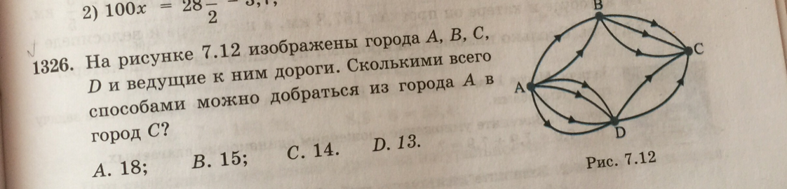 На рисунке 7.12 изображены города A, B , C, D и ведущие к ним дороги. Сколькими всего способами можно добраться из города A в город C?