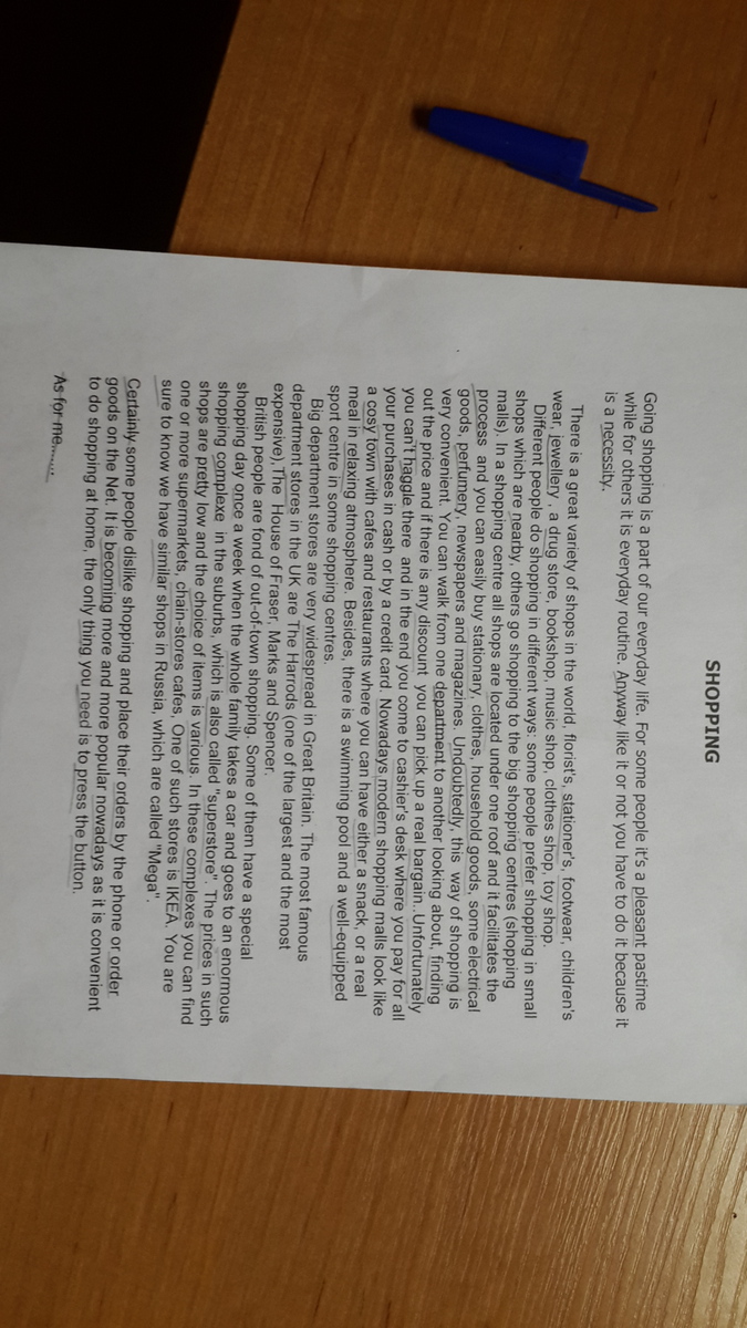 Поход за покупками это часть нашей повседневной жизни. Для некоторых людей это приятное времяпрепровождение,в тоже время для других это повседневная рутина. В любом случае, нравится это или нет,ты должен делать это,потому что это необходимость.