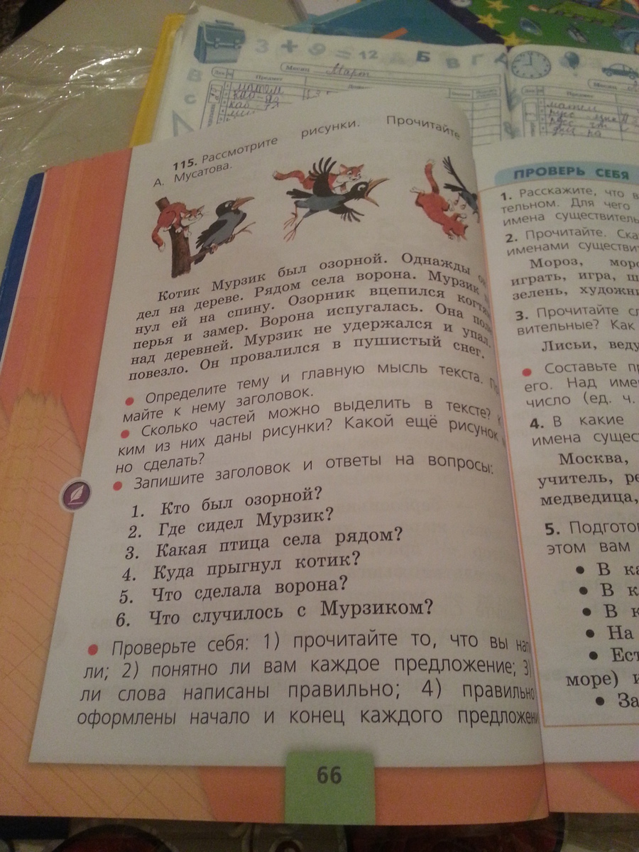 вопросы:1) кот мурзик ;2) на дереве;3) ворона;4) на спину Вороне;5) испугалась, полетела;6) он упал в мягкий сугроб.