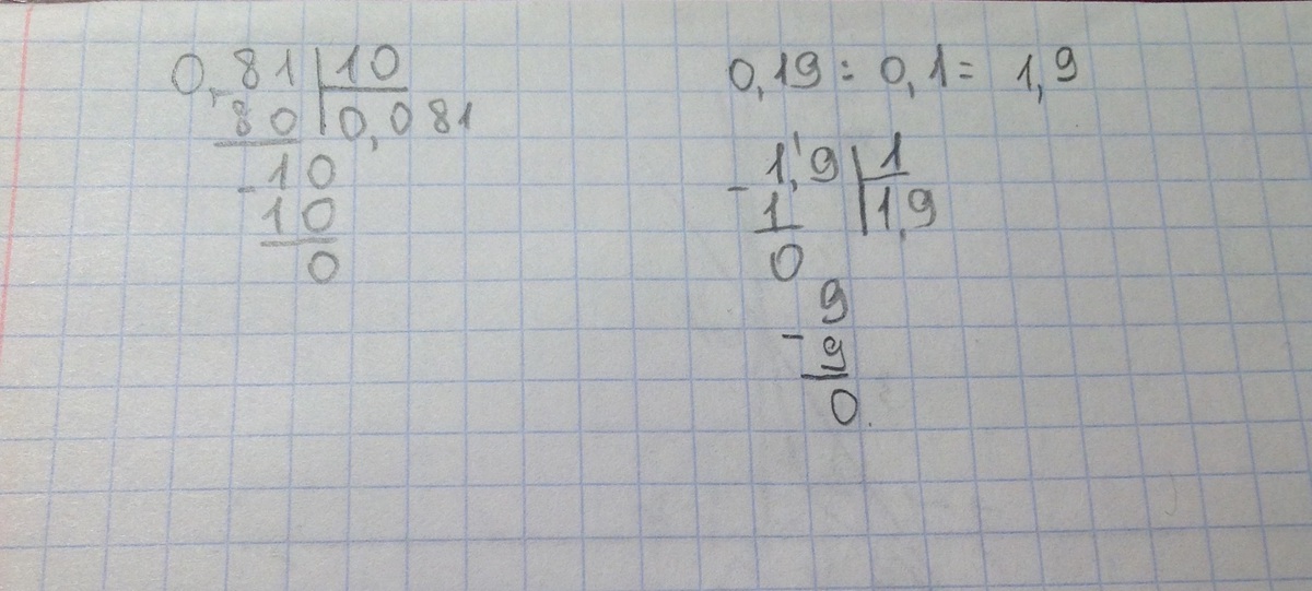 Во втором случае при делении на 0,1 запятая должна перенестись на 1 знак вправо у 0,19 и 0,1