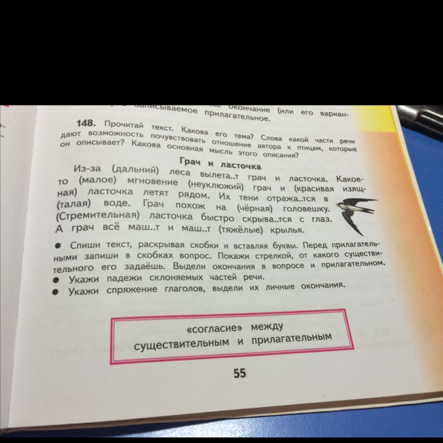 Из-за дальнего леса вылетает грач и ласточка. какое-то малое мгновение неуклюжий грач и красивая изящная ласточка летят рядом. их тени отражается в талой воде. Грач похож на чёрные головешку. Стремительная ласточка быстро скрывается с глаз. А грач Всё машет и машет тяжёлыми крыльями.