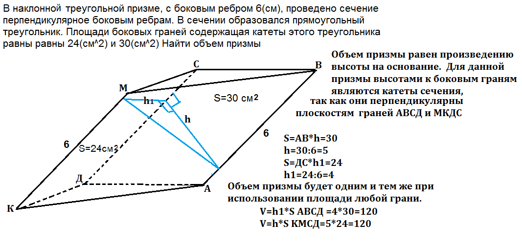 В наклонном треугольной призме, с боковым ребром 6(см), проведено сечение перпендикулярное боковым ребрам. В сечении образовался прямоугольный треугольник. Площади боковых граней содержащая катеты этого треугольника равны равны 24(см^2) и 30(см^2) Найти объем призмы
