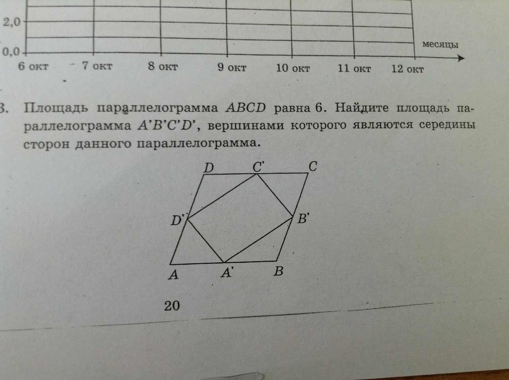 Площадь параллелограмма ABCD равна 6. Найдите площадь параллелограмма A'B'C'D', вершинами которого являются середины сторон данного параллелограмма (Картинка)