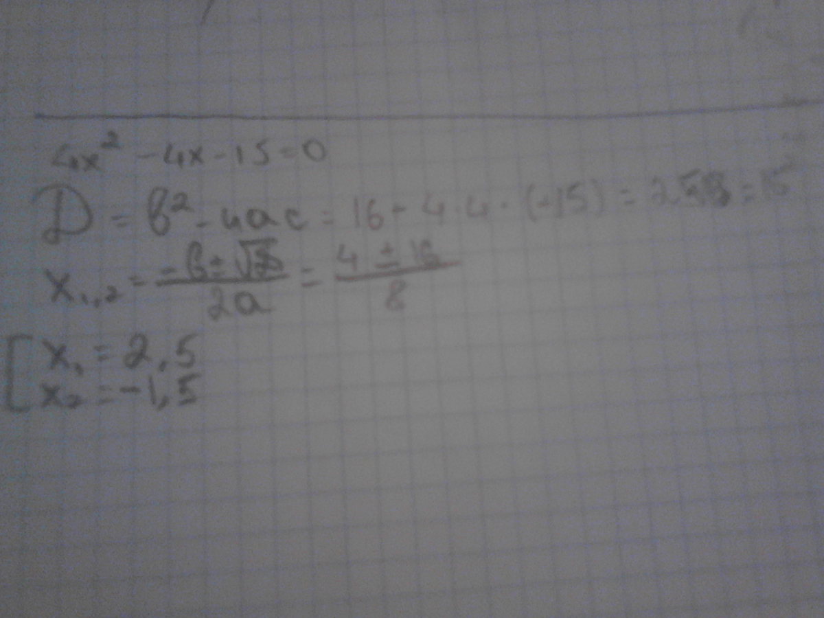D=(-4^2)-4*4*(-15)= 16+240=256 Корень из дискриминанта равен 16