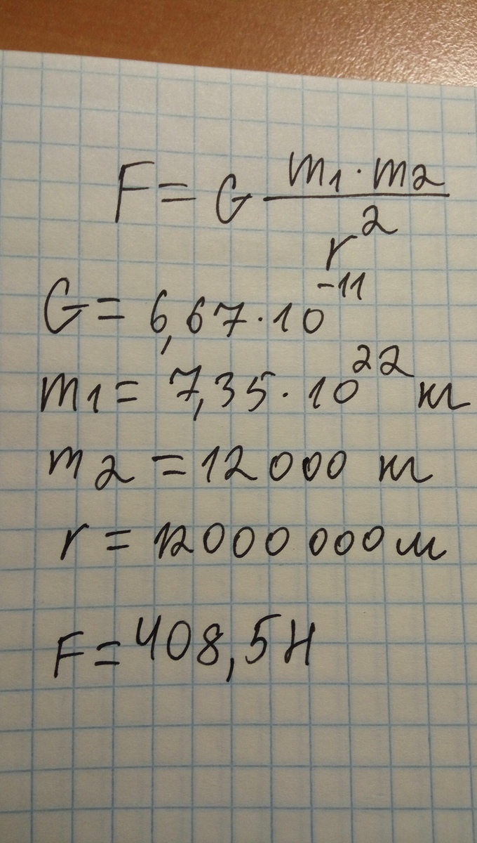 Масса Луны 7,35 *10(22) кг Космический корабль движется по орбите вокруг Луны.Расстояние от центра Луны до орбиты 12000км. Масса корабля 12т. Какова сила притяжения между Луной и кораблём?