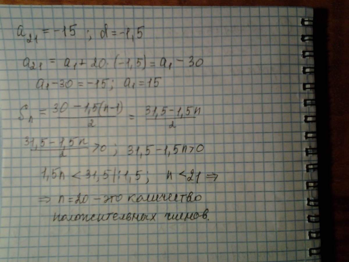 Решите пожалуйста.в арифметической прогрессии (аn) а21=-15 d=-1,5.Найдите число положительных членов этой прогрессии