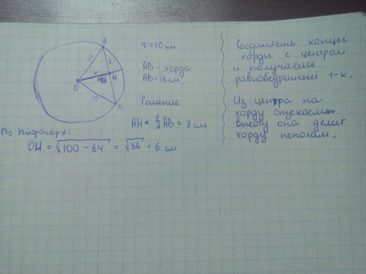 В окружности, радиус которой равен 10 см, проведена хорда длинной 16 см. Найти расстояние от центра окружности до данной хорды.